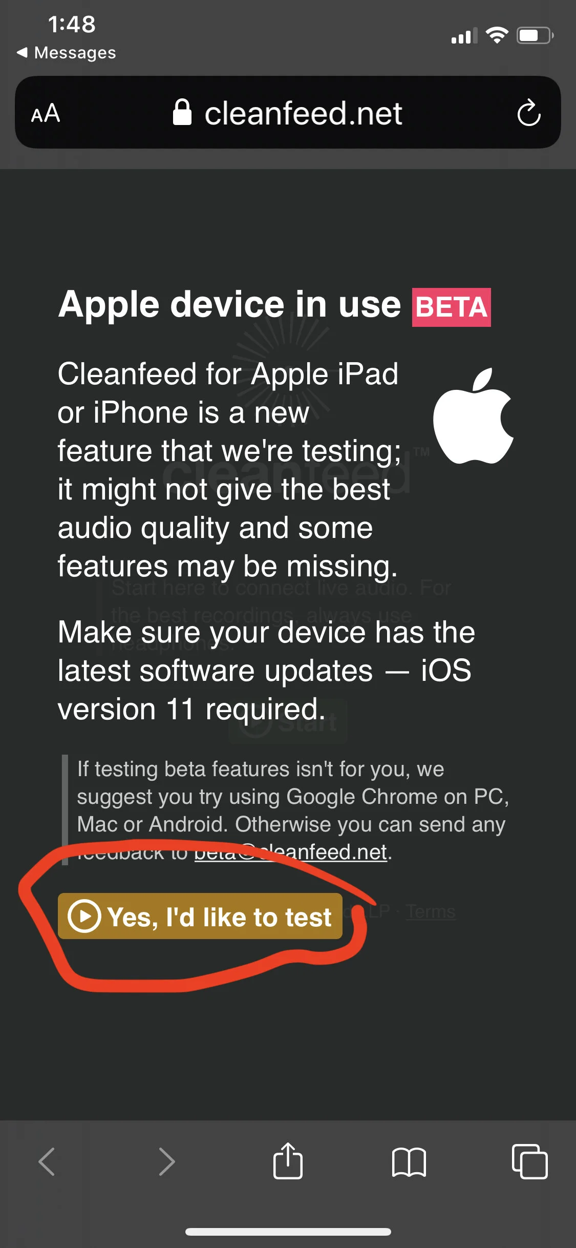 Cleanfeed will ask I you would to use “Beta.” Just click the button that says “Yes, I’d like to test.”